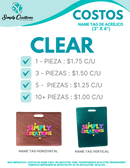 Costos de name tags no incluyen vinil transparente ni glitter transparent, tampoco incluye los plastic stings ni la impresión y/o aplicación de artes en DTF UV.